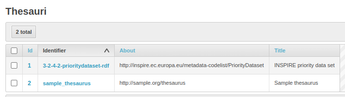 Los tesauros que tienen card_max == 0 se utilizan como listas de códigos: significa que serán referenciados dentro de GeoNode a través de su identificador para propósitos específicos.Habrá documentación ad hoc para cada una de dichas listas de códigos.