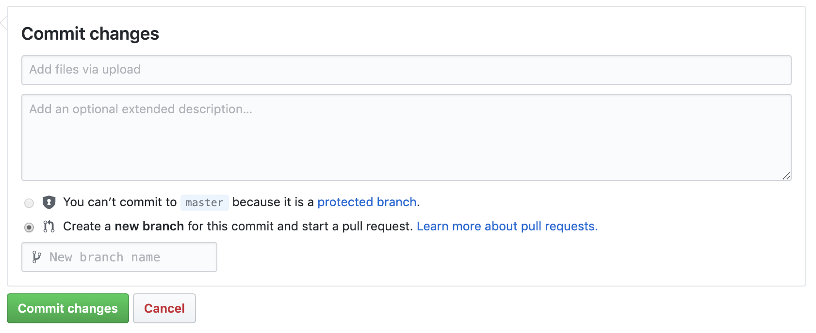 Haga clic en «Crear una nueva rama para esta confirmación…» y luego haga clic en el botón verde.