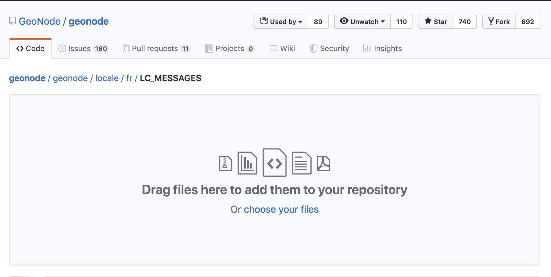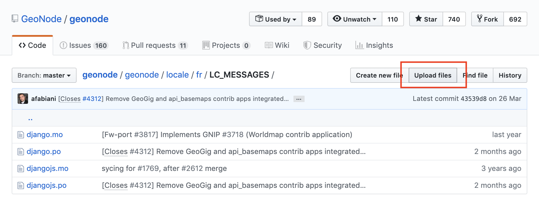 Para compartir nuestras actualizaciones, debemos cargar los archivos en el repositorio GitHub de GeoNode.Vaya a la posición correcta del archivo que, en caso de francés, es: https://github.com/GeoNode/geonode/tree/master/geonode/locale/fr/LC_MESSAGES