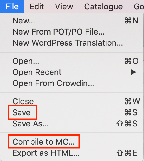 Poedit le preguntará dónde escribir el archivo «.mo». De forma predeterminada, esta es la misma carpeta en la que reside el “.po” editado. El archivo “.mo” se puede sobrescribir si es necesario.