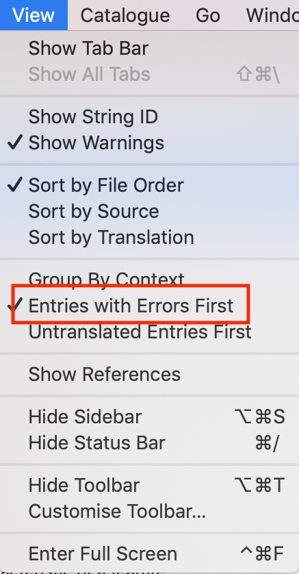 Desde el menú “ver” de “poedit”, asegúrese de que “Entradas con errores primero” esté marcado:
