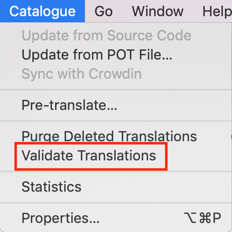 Luego haga clic en “Validar traducciones” en el menú “Catálogo”: