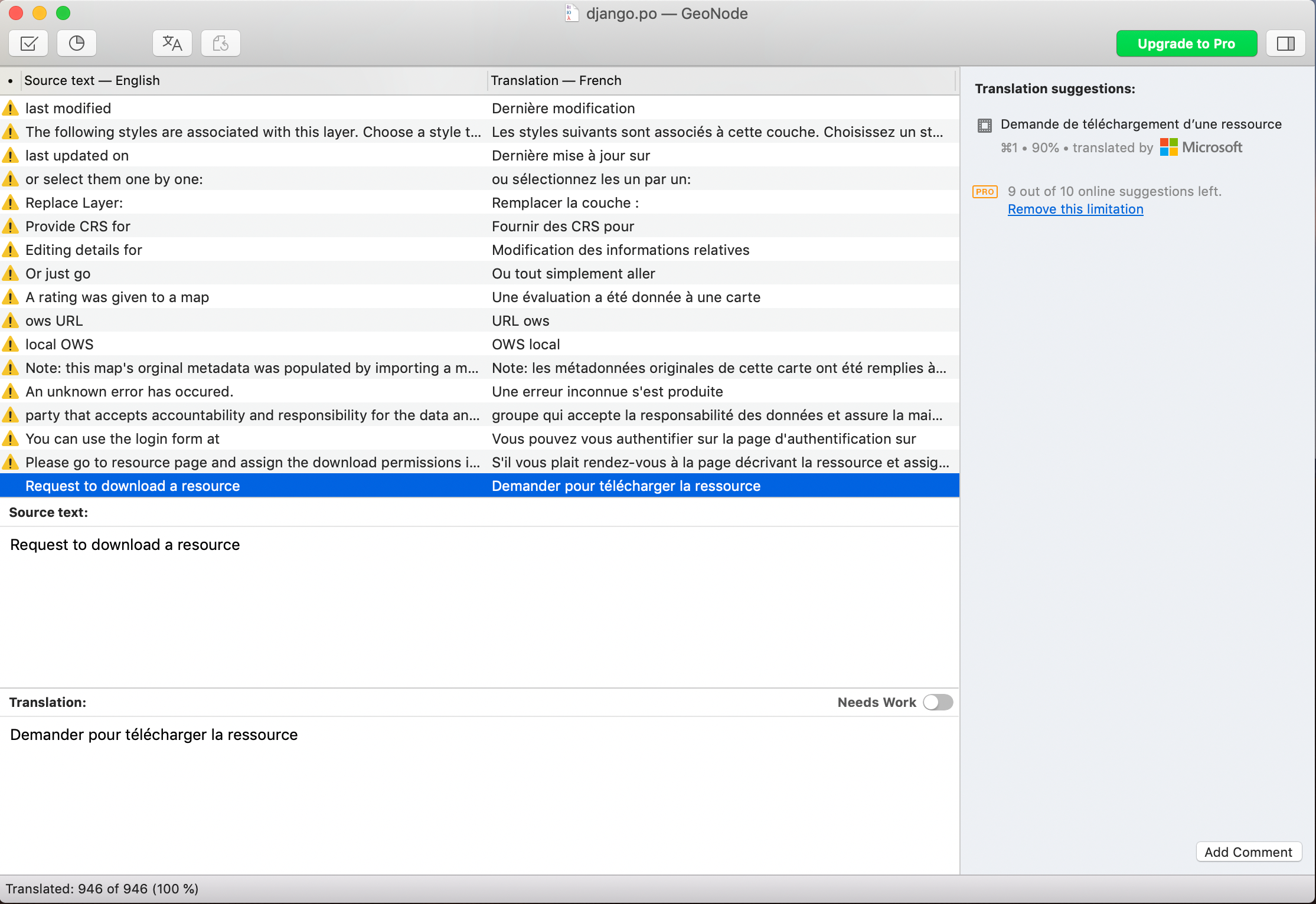 Durante la traducción, preste especial atención al botón que dice «necesita trabajo».En caso de que este botón esté marcado, la frase se marcará como «difusa» y se ignorará en GeoNode.