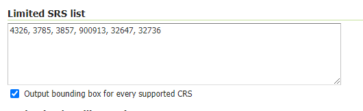 WMS: Especifica aquí la Lista SRS que vas a utilizar.Vacío significa todos los soportados por GeoServer, pero tenga cuidado ya que la salida