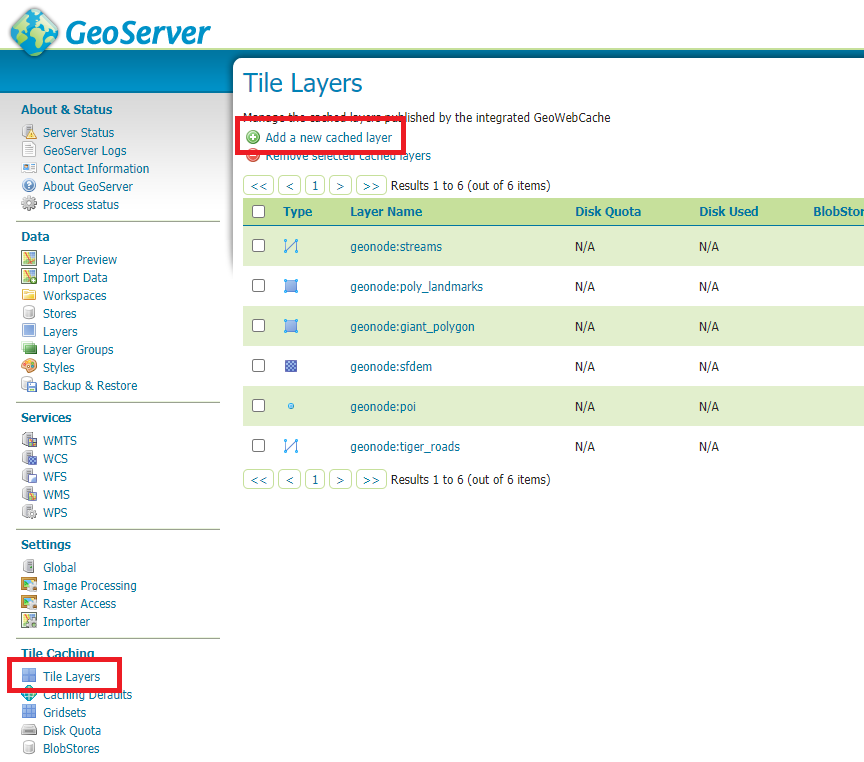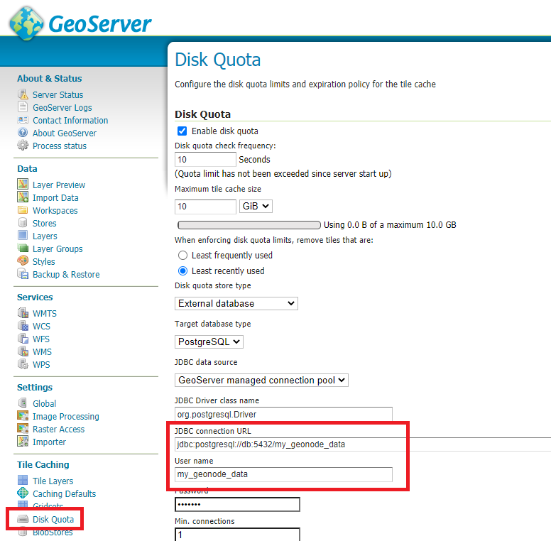 GeoWebCache DiskQuota siempre debe estar habilitado en un sistema de producción.En el caso de que esté habilitado, esto debe configurarse para utilizar un motor de base de datos como Postgis para almacenar sus índices.