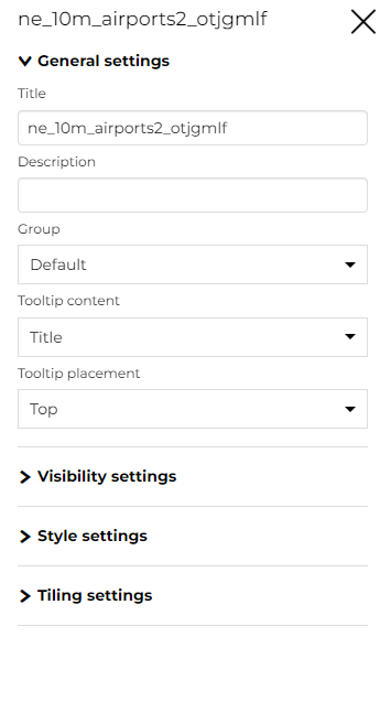 En la pestaña General del Panel de configuración puede personalizar el Título del conjunto de datos, insertar una Descripción, cambiar/agregar el Grupo del conjunto de datos y cambiar el Contenido de la información sobre herramientas y la Ubicación de la información sobre herramientas.