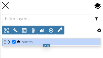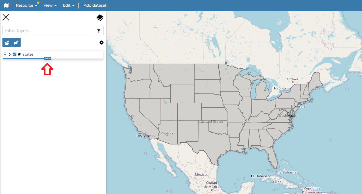 Administrar las propiedades de los conjuntos de datos como Opacidad (desplace el cursor de opacidad), Visibilidad (haga clic en |ocultar_botón| para que el conjunto de datos no sea visible, haga clic en |mostrar_botón| para mostrarlo en el mapa);