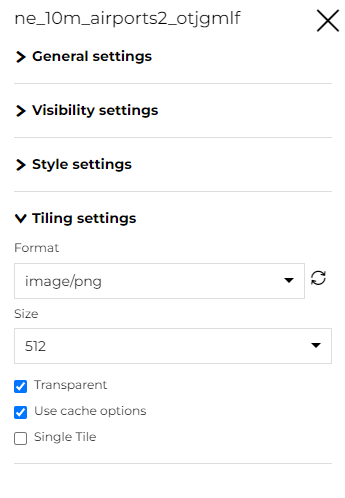 Haga clic en la pestaña Mosaico para cambiar el Formato de salida de las solicitudes WMS, el Tamaño del mosaico y habilitar/deshabilitar el Transparente, el Usar opciones de caché y el Mosaico único.