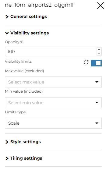 La pestaña Visibilidad donde puede cambiar la Opacidad de la capa y agregar los Límites de visibilidad para mostrar la capa solo dentro de ciertos límites de escala